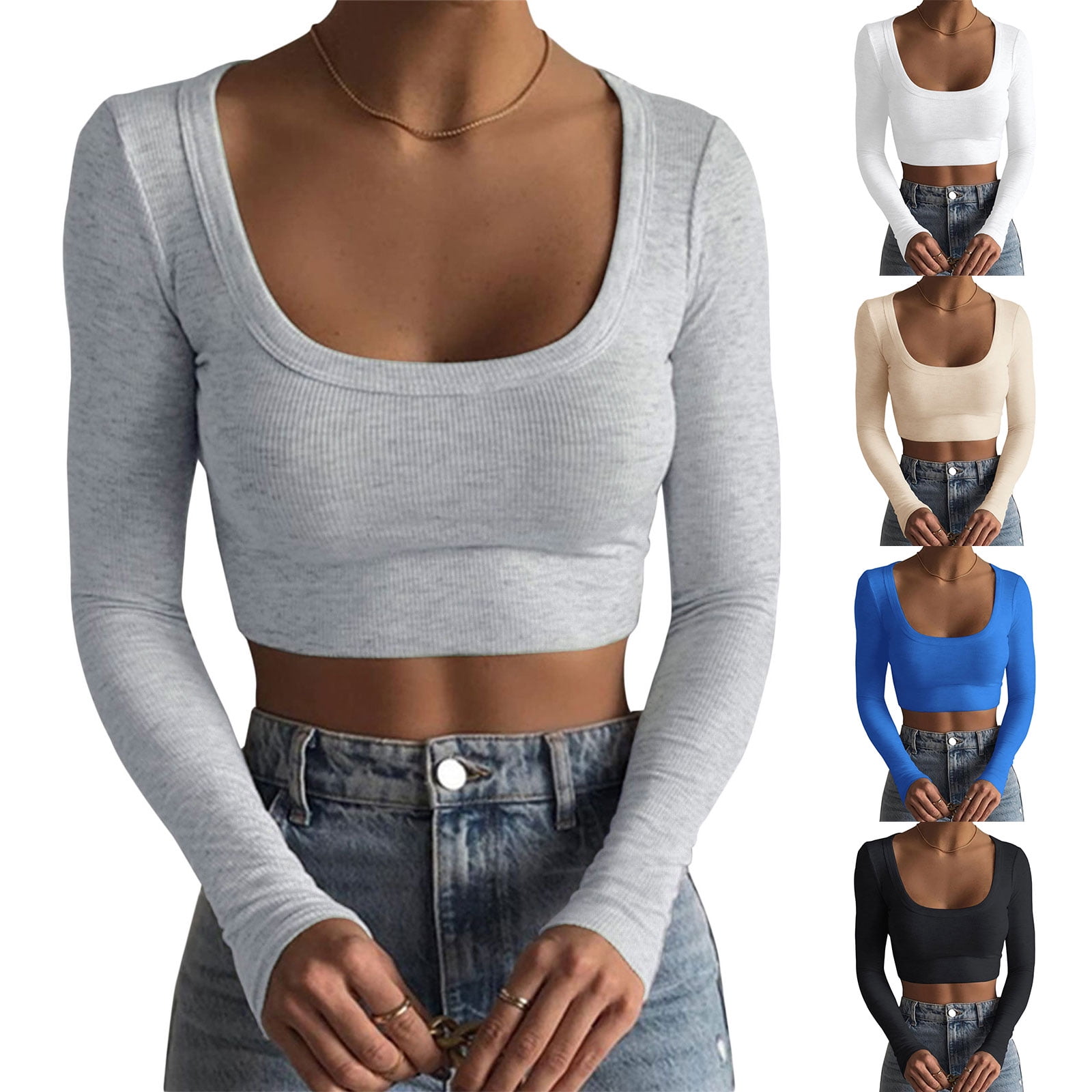 Xkwyshop Women S Square Neck Long Sleeve Crop Top Ribbed Knit Slim Fit Bodycon Skinny Cropped Tee Shirts Blouse Streetwear White M Walmart Com
